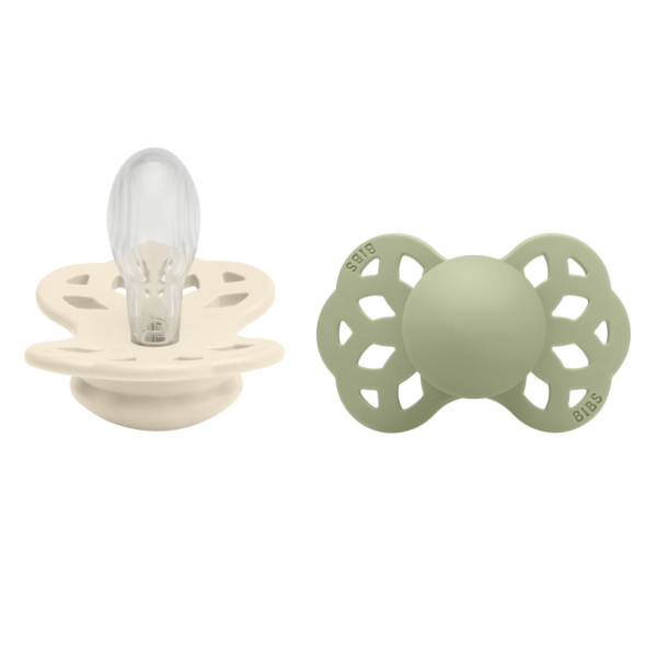 BIBS Infinity duda sa simetrično oblikovanim sisačem koji smanjuje pritisak na zube i čeljust te istovremeno omogućava pravilan zagriz i razvoj čeljusti. Sisač BIBS Infinity duda je izrađen je od silikona, a okvir dude je od polipropilena sigurnog za hranu. Duda ima pojačanje u obliku dodane teksture na silikonu kako bi bila otpornija na oštrije prve zubiće. BIBS Infinity dude dolaze u dvije veličine: