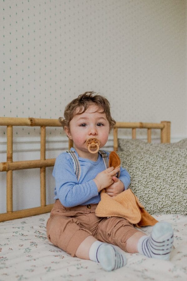 Tješilica je izrađena od iznimno mekanog organskog muslin pamuka. „Uši“ i jedna strana