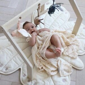Cam Cam® Igračka bumbar ima zabavne naborane teksture, zrcala, vrpce i malo zvončiće, koji će sigurno probuditi bebinu znatiželju i stimulirati njezina osjetila. Lako se može pričvrstiti na teretanu ili dječja kolica, pružajući zabavu u pokretu. Savršen poklon za novorođenče i bebu.