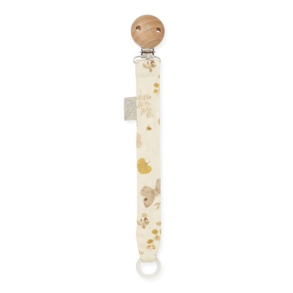 Simpatičan i praktičan Cam Cam® Vezica za dudu – GOTS Butterflies dostupan u raznim Cam Cam otiscima. Držač za dudu ima jaki prsten od 100% prirodne gume, koji je spojen iznutra kako bi se izbjeglo uvijanje i pametnu drvenu kopču s metalom bez nikla za pričvršćivanje držača na djetetovu odjeću. Držač za dudu je ispitan i ispunjava sve sigurnosne zahtjeve europskog/danskog standarda “DS/EN 12586 + A1”. Nemojte koristiti kao igračku i nemojte dopustiti bebi da spava s držačem za dudu. Prije svake uporabe provjerite držač i bacite ga ako ima znakova istrošenosti.