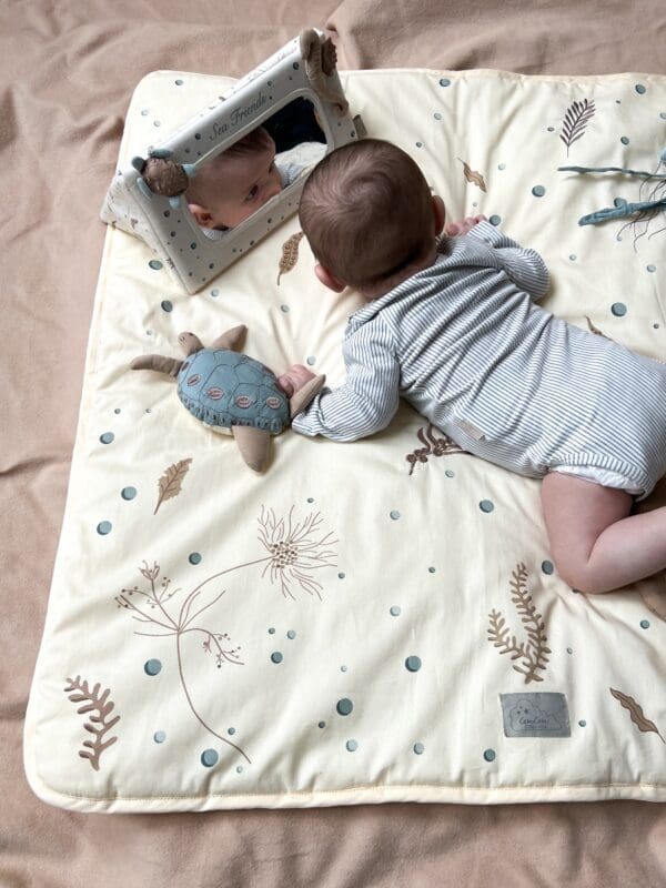Cam Cam® Ogledalo OCS- Sea Garden je idealno za motiviranje vaše bebe na trbuščić, podizanje glavice i vježbanje leđne muskulature. Ogledalo za trbuščić ima zabavne naborane teksture i piskutalj koji može stimulirati fine motoričke sposobnosti kada bebe mogu dohvatiti i uhvatiti ogledalo. Savršen poklon za novorođenče i bebu. Tummy Time Mirror u plavim nijansama.