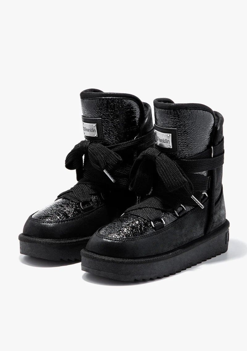 Komad koji odiše après-ski esencijom s našim potpisom D.Franklin. Ove čizme imaju visokokvalitetnu vodoodbojnu tkaninu od mikrovlakana. Vezice s više položaja za optimalnu potporu i ojačane zakovice. Prednja strana je završena sa svjetlucavim detaljima. Izrađen od PETA odobrenih veganskih materijala i unutarnje podstave od 30% recikliranih materijala (Global Recycled Standard).