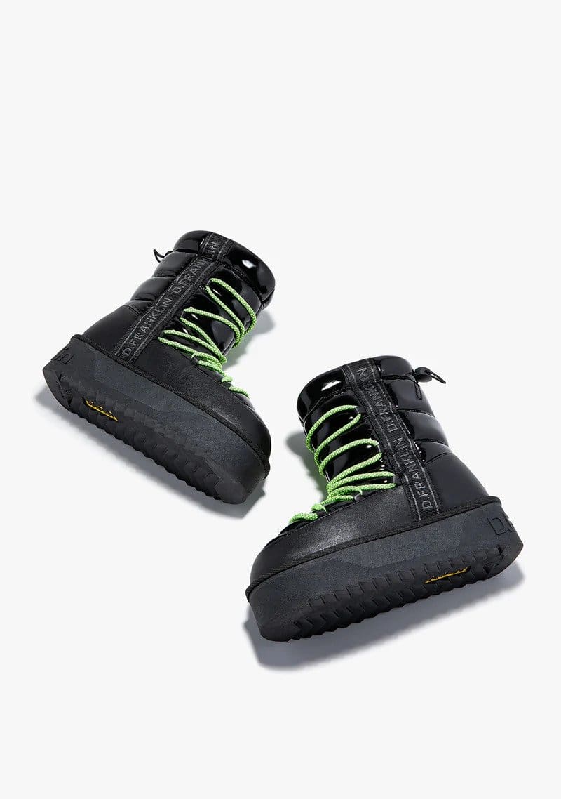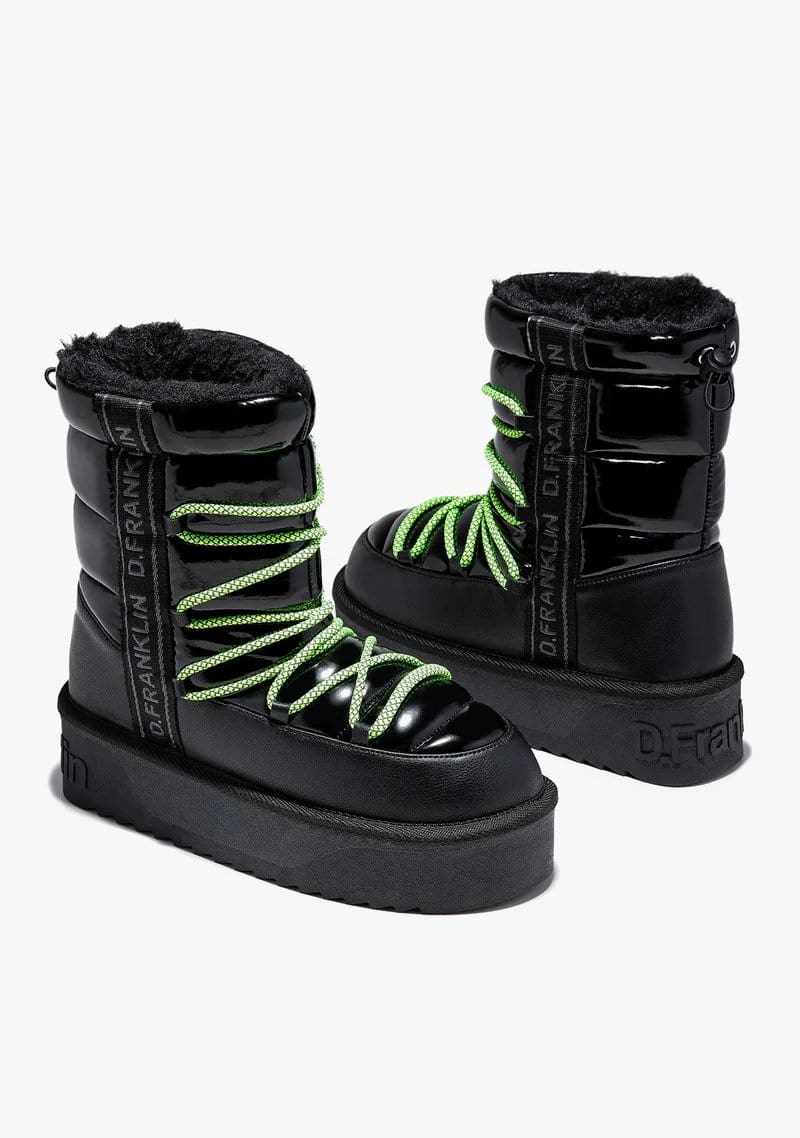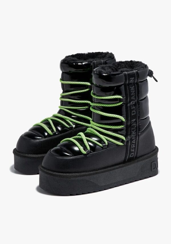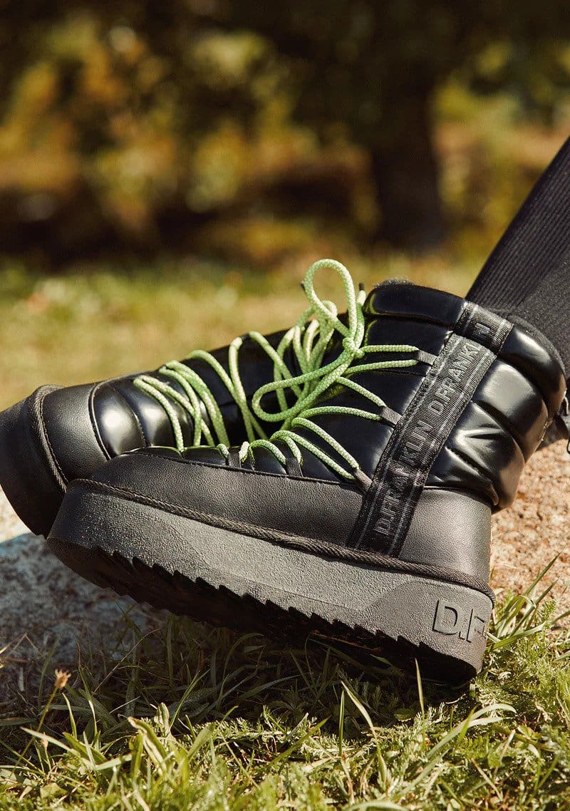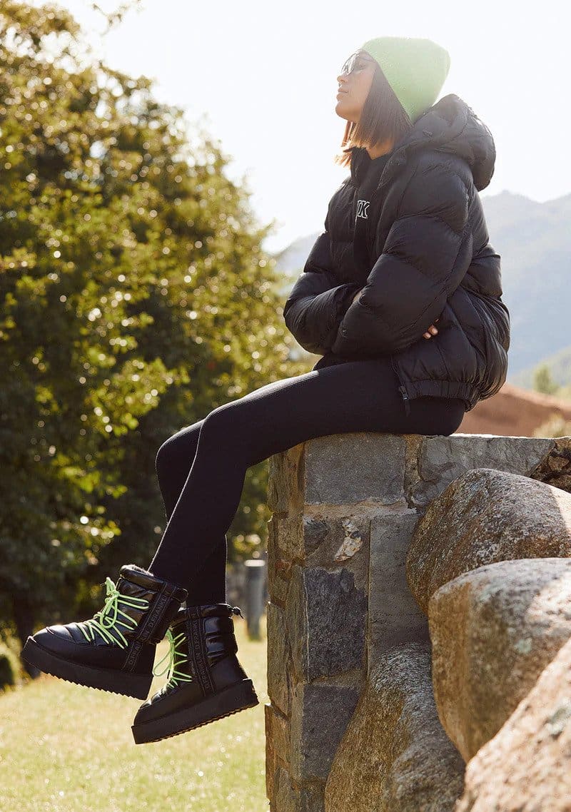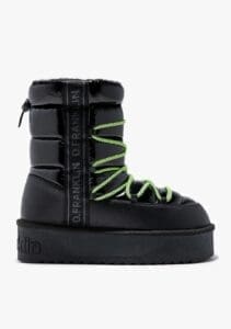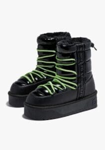 Prošiven završni dizajn koji definira trend après-ski. Ove crne čizme imaju visokokvalitetnu vodoodbojnu tkaninu. Trail vezice s više položaja pružaju optimalnu potporu i imaju ojačane zakovice. Osim toga, podstava od sintetičkog krzna dodaje vrhunski zimski štih. Napravljen od PETA odobrenih veganskih materijala i podstava od 30% recikliranih materijala (Global Recycled Standard).