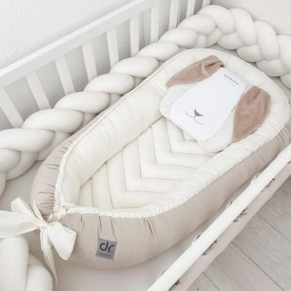 Baby nest Dada&Rocco je dizajniran da olakša život roditeljima i njihovim bebama, apsolutni “must have” za odmor vaše bebe. Izrađen s puno ljubavi i nježnosti da unese veselje u vaše domove. Dada&Rocco baby nest je poseban po tome što uz njega dolazi i gratis podloga koja se po potrebi može izvaditi i koristiti kao podloga za prematanje, za kolica… Pomoću vezice koja ide cijelom dužinom baby nesta možete sami prilagođavati potrebnu širinu prema veličini djeteta. Dno na kojem se nalazi predivna mašna se može odvojiti tako da ga beba može koristiti i kada ga preraste. Uvijek koristiti uz nadzor odrasle osobe.