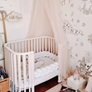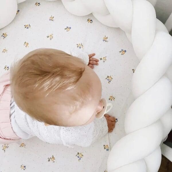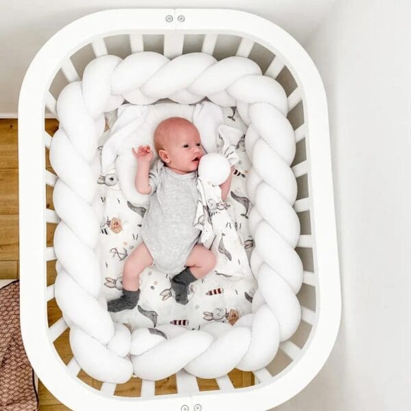 Uz pletenice dobijete i dodatne vezice tako da je možete zavezati i fiksirati za krevetić. Svojim izgledom upotpuniti će i ukrasiti svaku sobicu i krevetić. Pogodna je za krevetiće 120×60, 140×70 kao i za ovalne krevetiće.