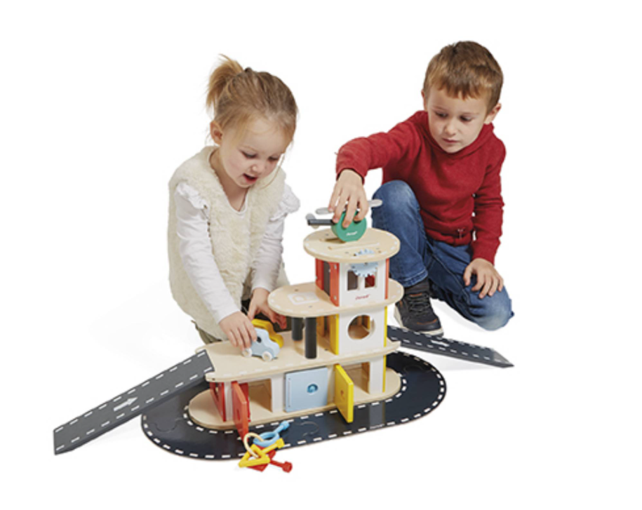Moći će započeti s istraživanjem 3 razine ove sjajne igračke s 3 autića i drvenim helikopterom koji su mu priloženi. Vanjski krug i rampe stvaraju okruženje za najluđe avanture! Mehanički lift omogućuje djeci da dovedu vozila do razine parkinga.