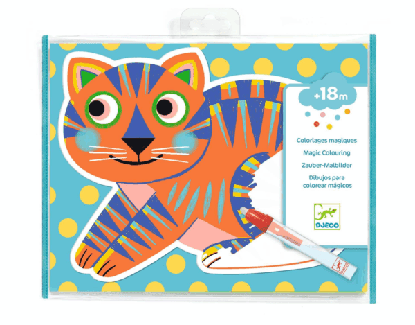Sadrži 4 slike za bojanje na mekanim plastičnim pločama (s bijelim područjima koja nestaju), olovku sa spremnikom za vodu i stalak od kartona