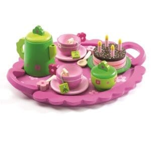 Ovaj veseli drveni set sadrži čvrsti drveni pladanj, zeleni čajnik, dvije roze šalice, dvije žličice, posudu za šećer i naravno – rođendansku tortu!