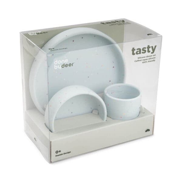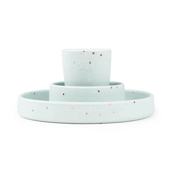 Praktičan, protuklizan, mekan, izdržljiv, otporan na toplinu te jednostavan je za držanje u rukama. Prikladan je za korištenje u mikrovalovnoj pećnici, pećnici, zamrzivaču, perilici posuđa. Uključuje tanjur, zdjelicu i mini šalicu. Savršen set za mališane prilikom prvih obroka. Zaobljeni unutarnji rubovi vašem mališanu olakšavaju samostalno hvatanje hrane.