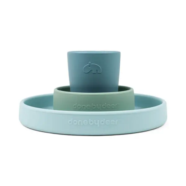 Praktičan, protuklizan, mekan, izdržljiv, otporan na toplinu te jednostavan je za držanje u rukama. Prikladan je za korištenje u mikrovalovnoj pećnici, pećnici, zamrzivaču, perilici posuđa. Uključuje tanjur, zdjelicu i mini šalicu. Savršen set za mališane prilikom prvih obroka. Zaobljeni unutarnji rubovi vašem mališanu olakšavaju samostalno hvatanje hrane.