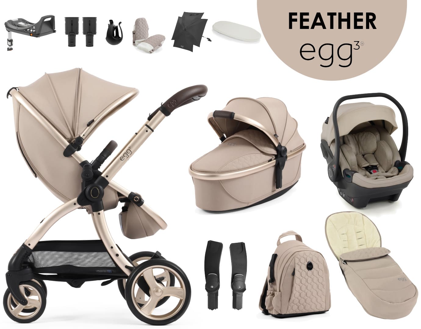 | 12u1 set egg3 kolica uključuje: konstrukciju, košaru za novorođenče, sportsko sjedalo, 2 kišne navlake (za sportsko sjedalo i košaru za novorođenče), zaštitu od komaraca, zaštitu za noge za sportsko sjedalo, egg® shell i-Size autosjedalicu, adaptere za autosjedalicu, ruksak za kolica, zimsku vreću, zimske rukavice za roditelje (svi dijelovi seta su u istoj boji), držač za bočice, adaptere za podešavanje visine, isofix bazu za egg Shell autosjedalicu, plahte za košaru za novorođenče i suncobran. |