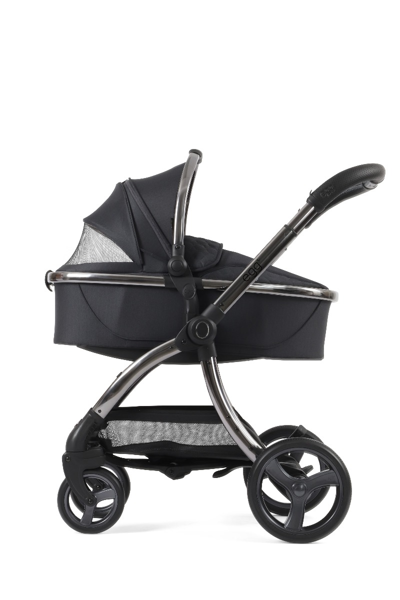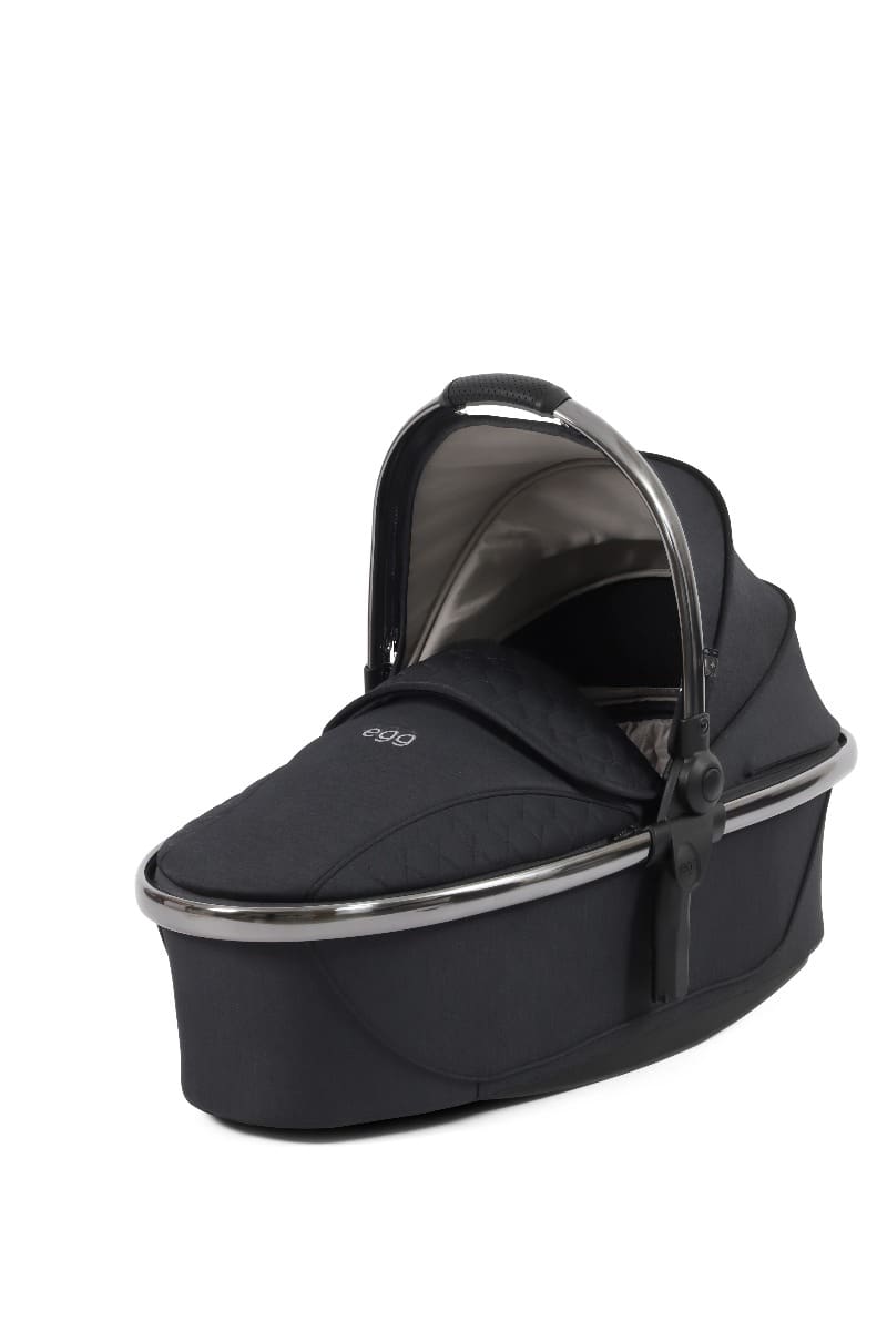 Košara za novorođenče egg3® kolica stvara savršeno utočište za prvih šest mjeseci života vašeg djeteta, pružajući luksuzno i sigurno okruženje koje osigurava udobnost i zaštitu vaše bebe u ležećem položaju. Sadrži novi održivi Sorona® madrac, koji je periv, prozračan i bez kemikalija. Nova košara za novorođenče također uključuje proširivi krović s ventilacijskim prozorom. Kako biste lakše mogli uspavati svoju bebu, nova košara ima mogućnost ljuljanja.