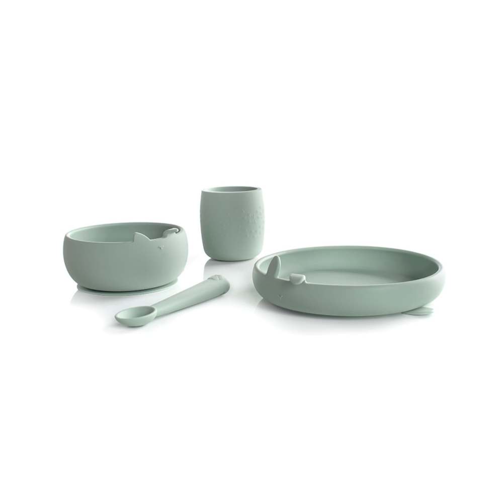 Zabavan, praktičan silikonski set za jelo od 4 dijela. Žlica je ergonomskog oblika, a silikonska čašica ne klizi i prilagođava se bebinim rukama i pomaže joj u učenju držanja i pijenja. Osim toga, i zdjela i tanjur imaju jaki vakuum za bolje prijanjanje na površinu i veću sigurnost. 4 komponente se mogu složiti jedna u drugu kako bi zauzimale što je moguće manje prostora kada su pohranjene.