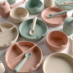 Zabavan, praktičan silikonski set za jelo od 4 dijela. Žlica je ergonomskog oblika, a silikonska čašica ne klizi i prilagođava se bebinim rukama i pomaže joj u učenju držanja i pijenja. Osim toga, i zdjela i tanjur imaju jaki vakuum za bolje prijanjanje na površinu i veću sigurnost. 4 komponente se mogu složiti jedna u drugu kako bi zauzimale što je moguće manje prostora kada su pohranjene.