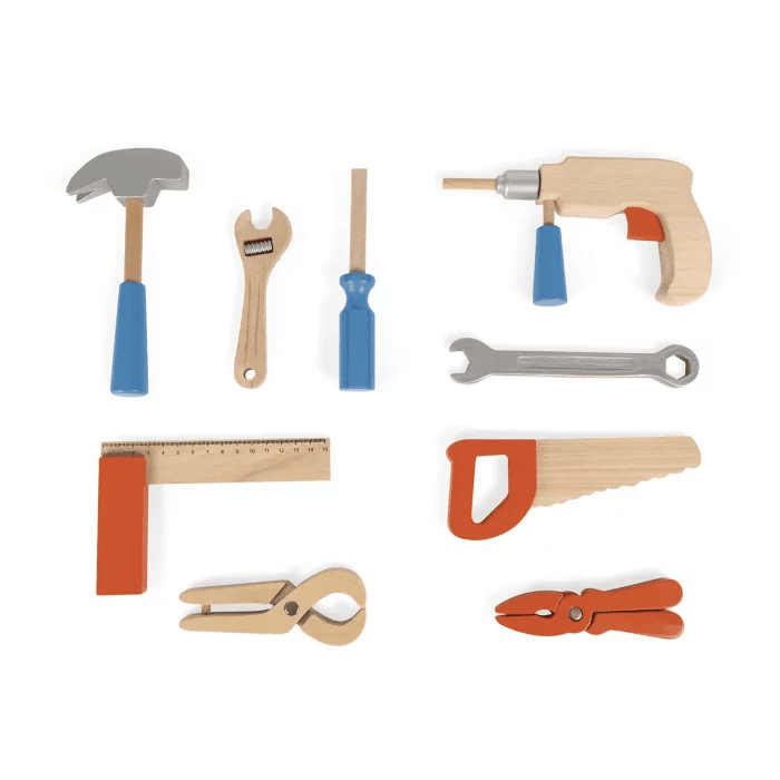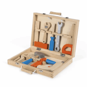 Gotovo u svakom mališanu čuči maleni majstor koji je bar u jednoj fazi odrastanja imao potrebu nešto popraviti ili napraviti. Kako bi vaši mali majstori bili dobro opremljeni za sve važne radove i popravke, tu je ovaj dobro opremljeni drveni kofer s alatima. U njemu se nalazi bušilica, čekić, pila, metar, odvijač te nekoliko vrsta kliješta i ključeva. Kada radovi budu gotovi, vaši mališani mogu lako sve pospremiti u praktičan kofer i prenijeti ga na sljedeće mjesto koje zahtijeva njihovu stručnu intervenciju.