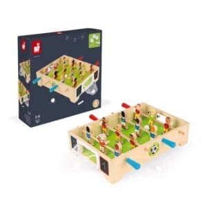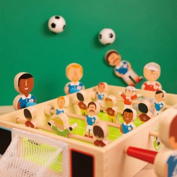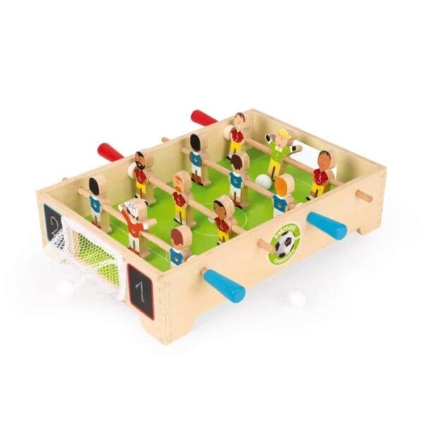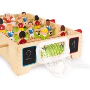 S obje duže strane stola nalaze se dvije ručke i na svakoj su po 3 igrača. Na kraćim krajevima su golovi i mjesto gdje kredom možete upisati rezultat. Uz set dolaze i 3 loptice. Sve je izrađeno od drva i strpljivo čeka svog malog izbornika da svoje nogometaše dovede do pobjede.