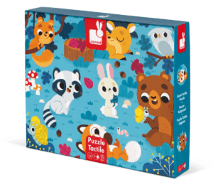 U setu se nalazi 7 dodirnih puzzli, a po teksturi se razlikuju lisica, medvjedić, srna, zeko, sova, leptir i lišće.