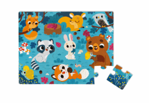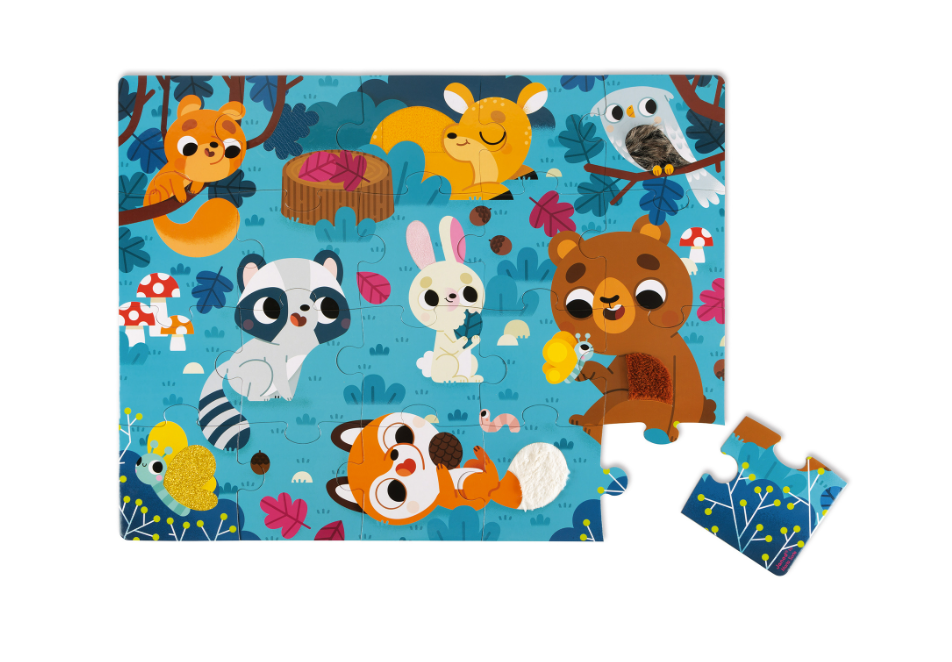 Medo razgovara s leptirićem, srna sanja najljepše snove, zeko jede svoju večeru, a sovica ih sve zagonetno promatra. Međutim, kako bi vidjeli potpunu šumsku idilu potrebno je u cijelosti složiti puzzle. One su ujedno dodirne puzzle na kojima je dio napravljen od materijala različite teksture, što kod mališana stimulira osjetilo dodira.