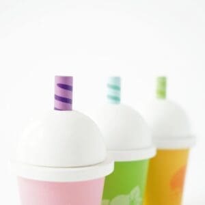 Tri slatka, voćna smoothieja čekaju samo na vas! Ovaj ukusni trio za ponijeti, sa prugastim slamčicama, super je dodatak igri pretvaranja vaše djece.