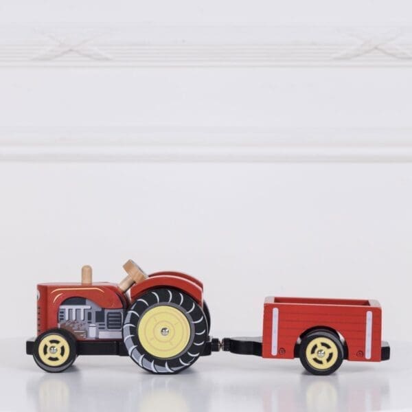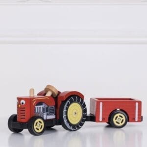 Kreni na vožnju drvenim traktorom crvene boje i upoznaj životinjice na farmi.