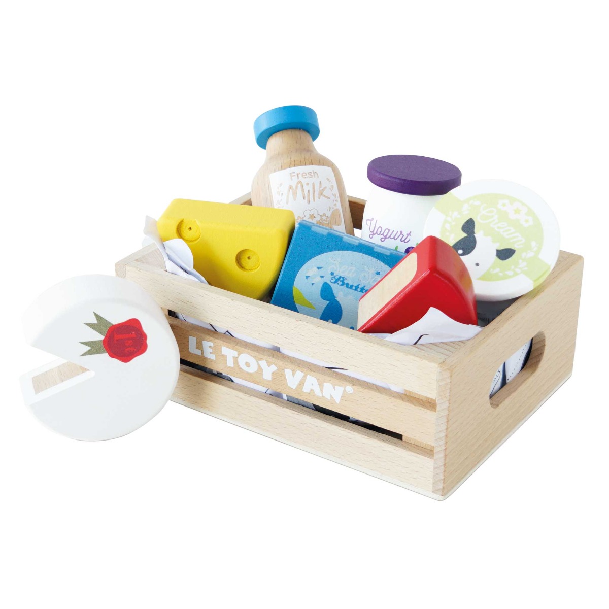 Drvena igračka kašeta s mliječnim proizvodima ima baš sve – od mlijeka, maslaca, jogurta pa sve do različitih vrsta sireva.