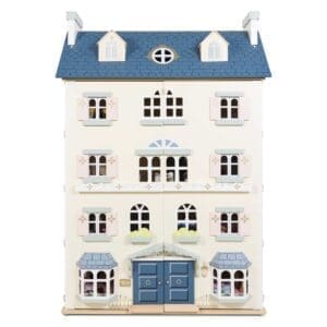 Kućica Palace najluksuznija je i najveća drvena Le Toy Van kućica. Ima ukupno 5 katova, a svaki krasi različit uzorak nježno plavih tapeta. Spremna je za useljenje vaše male kraljevske obitelji lutaka! Ima mnogo prozora, čak i sa stražnje strane, a većina se može otvarati. Klinci će uživati u igri s lutkicama koje će s kata na kat prelaziti stepenicama s rukohvatima, a do tavana ih vode male drvene ljestve. Detalji poput male nadstrešnice iznad ulaznih vrata i zlatni ukrasi po pročelju kućici daju poseban šarm.
