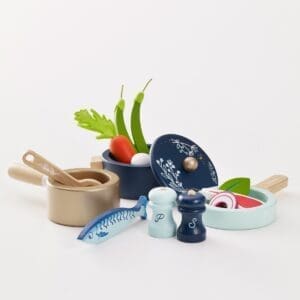 U setu se nalazi lonac s poklopcem, tava, lonac, kuhača, sol i papar. Dodajte u tavu malo mašte, dobro promiješajte i dobit ćete ukusan obrok za sve plišance, bebe i ostale neizostavne goste.