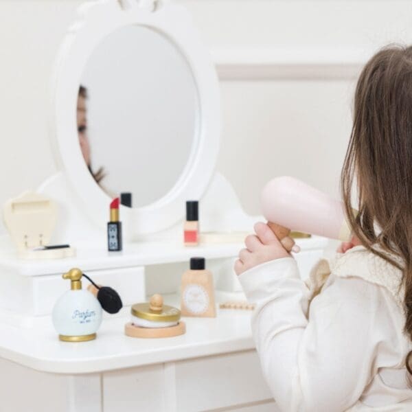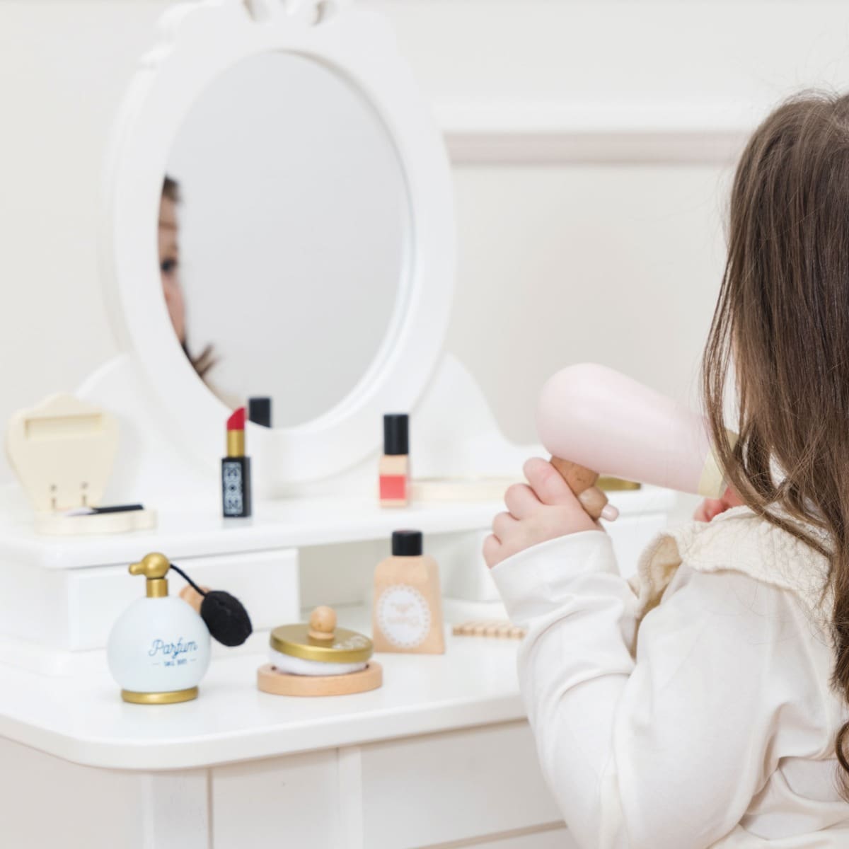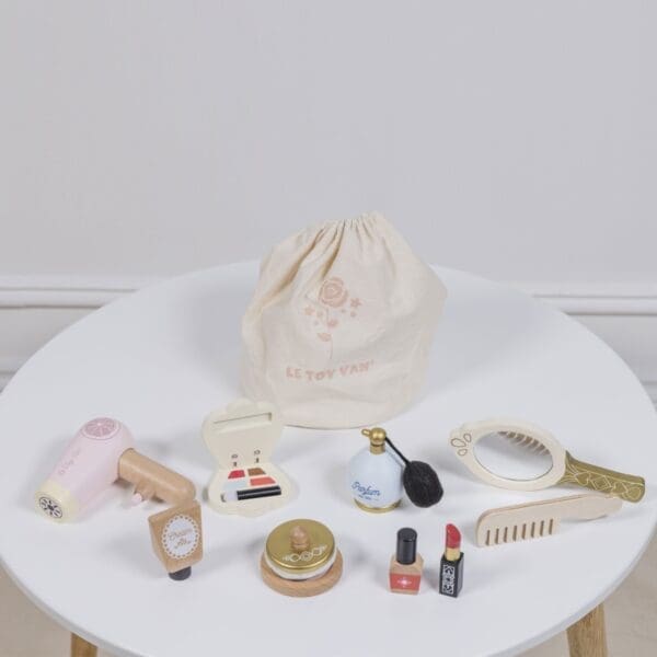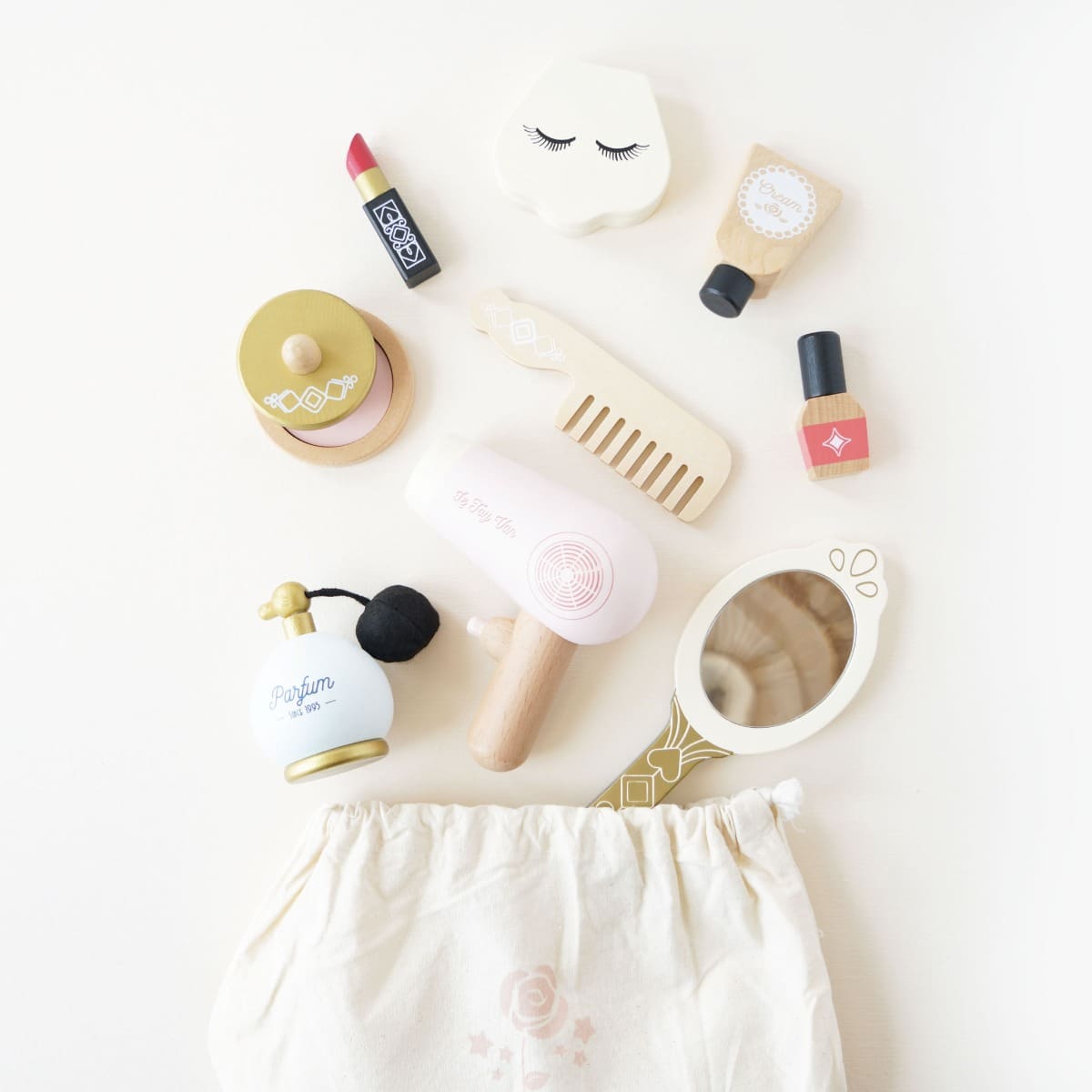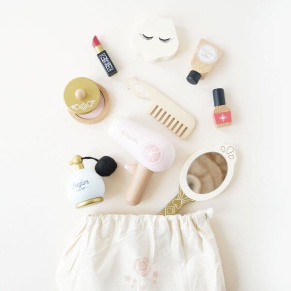 San svake djevojčice dolazi u pamučnoj vrećici i pun je dodataka za uljepšavanje. Za najljepšu frizuru u gradu tu je pastelno rozi fen i drveni češljić. U ovom setu nalazi se i krema za lice, ogledalce, puder, ruž za usne, lak za nokte i make up set u obliku školjke. Oh da – tu je i igračka parfem s pumpicom!