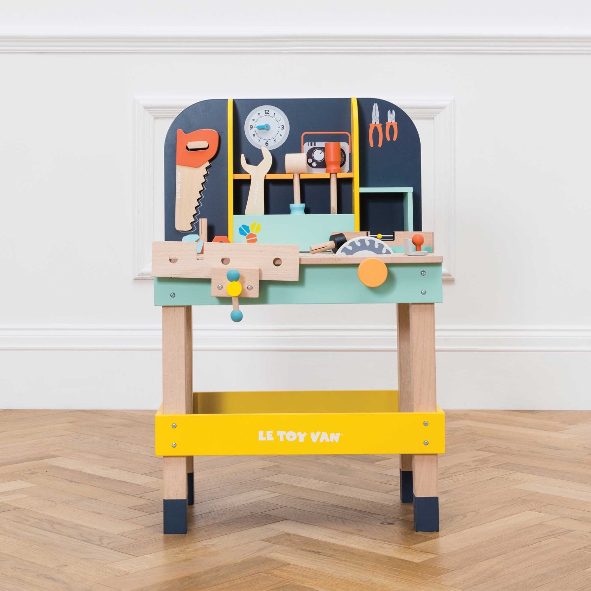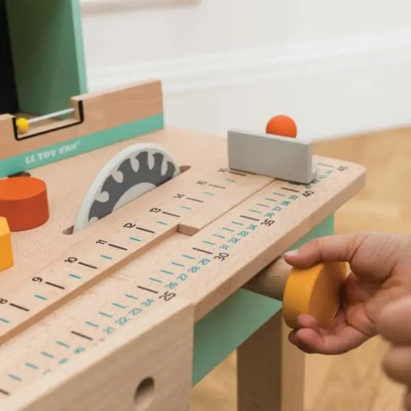 Onda sigurno znate da svaki pravi majstor treba imati dobar alat. Ovaj izdržljivi radni stol ima sve što je potrebno za jedno dobro popravljanje. Izrađen je od kvalitenog drva i sadrži 12 alata. U setu se nalazi: pila, čekić, odvijač, ključ za matice, libela, 2 matice, 2 vijka, 2 čavla i komad drveta. Stol je opremljen s kružnom pila, mjeračem i škripcem. Stražnji zid ima policu za pospremanje alata i kuku za pilu. Stražnja ploča može se koristiti kao ploča za pisanje i ima jedan zgodni sat kojem se mogu pomicati kazaljke.