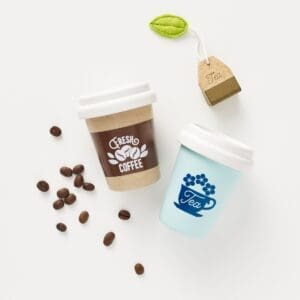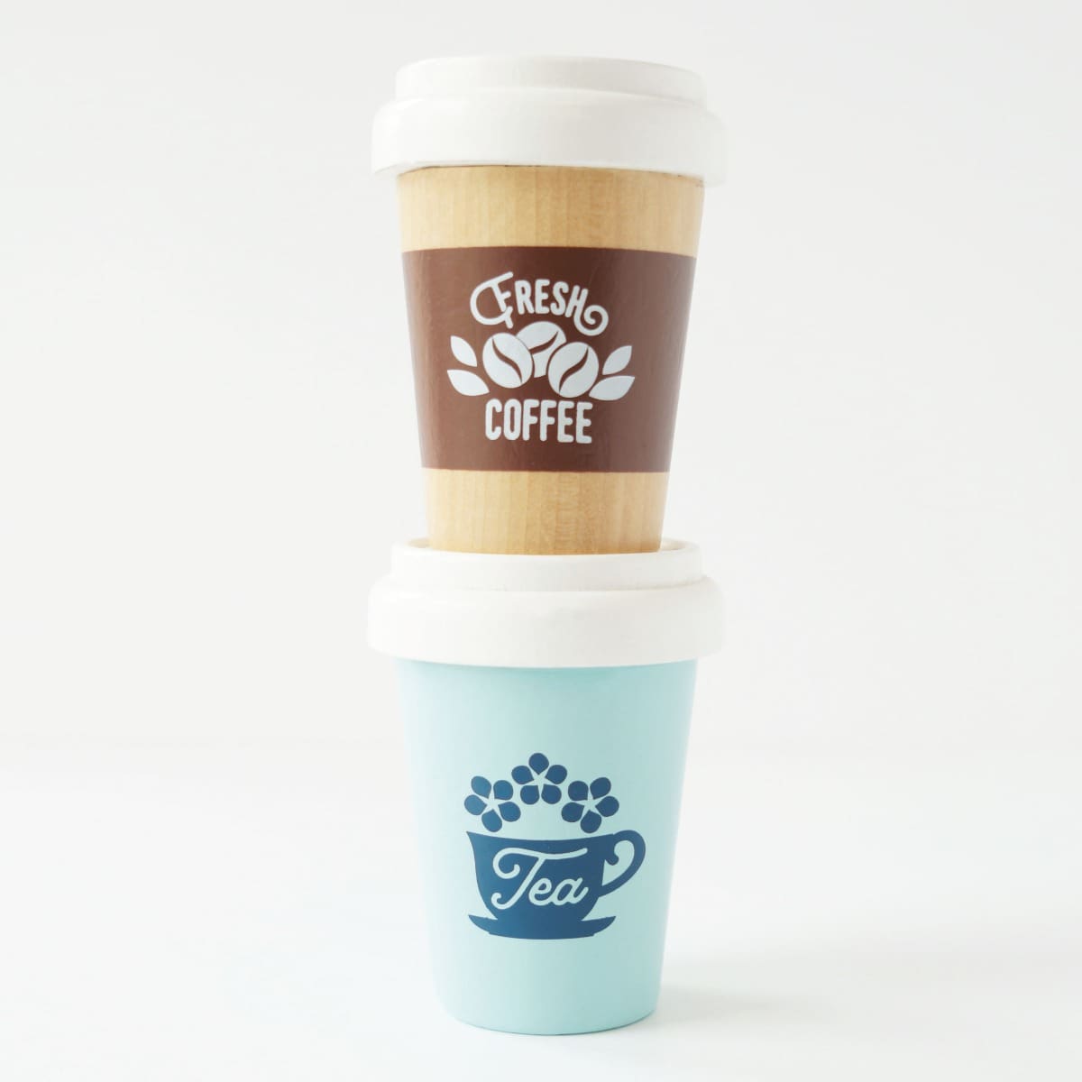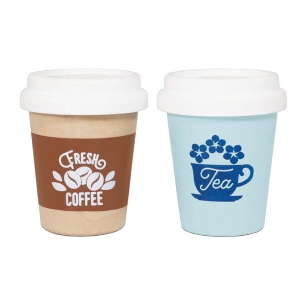 Ovaj slatki set je super igračka za maštovitu igru vaše djece. Svaka šalica koja uistinu izgleda kao prava, ima svoj poklopac i logotip, te je izrađena od održivog drva i ukrašena sigurnim bojama.