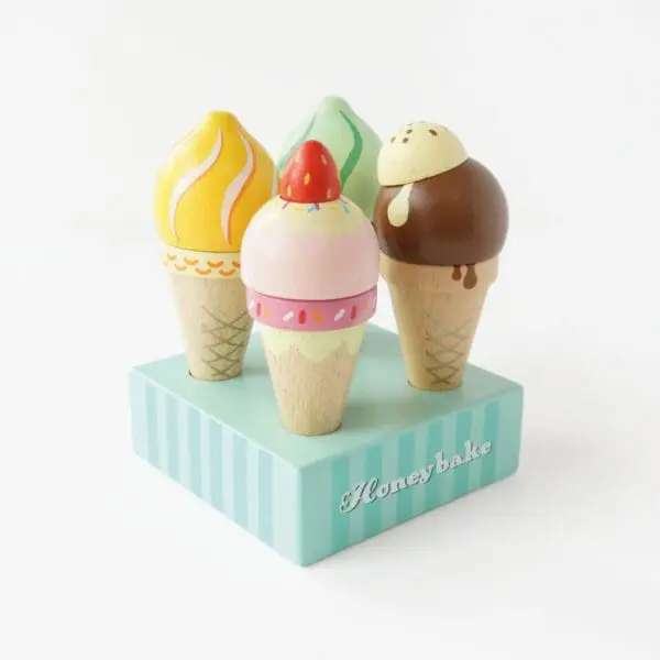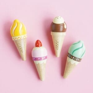 Ako ste za kornet, uživat ćete u igri s Le Toy Van kompletom od četiri, ručno oslikana, drvena sladoleda. Sudeći po žarkim bojama, svi su sladoledi svježih, voćnih okusa, uz iznimku onog s okusom čokolade. Čini nam se kao da su ovi sladoledi došli s kamiona sa sladoledom Dolly!