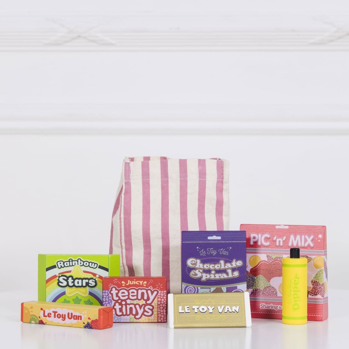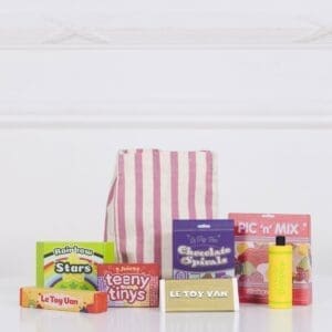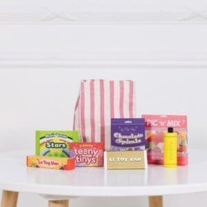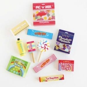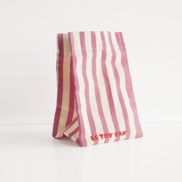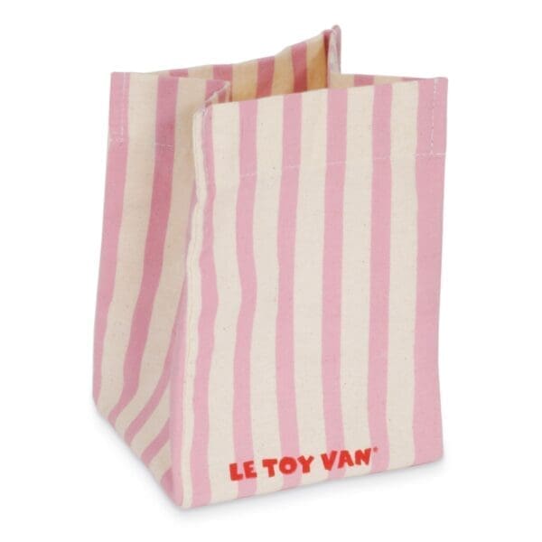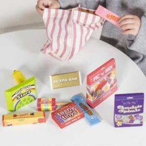 U pamučnoj, prugasto rozoj vrećici stižu nam bomboni svih vrsta, lizalice i čokoladice – pravi šećerni raj. Osim što je ova igračka preslatka, ona je u potpunosti napravljena od drva – nema plastike! Bojana je jarkim netoksičnim bojama, a najveći šarm slatkišima daje zlatna boja.