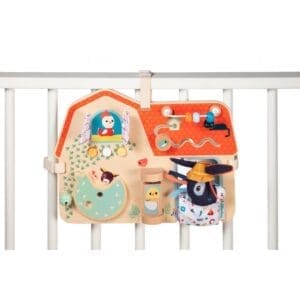 Vesela družina Liliputanaca krenula je u avanturu istraživanja farme svog prijatelja Ignacea. Uz ovu ploču za aktivnosti na farmi, vaša će beba moći pritisnuti male gumbe, okretati kotač, oglasiti zvono, otvoriti kapke da vidi kokoš Paulette i kliziti mnoštvo malih igračaka za rano učenje. Nadalje, mali magarac Ignace pliš je uključen kako bi bebine avanture na farmi bile još zabavnije. Ova ploča za aktivnosti može se pohvaliti šarenim materijalima i teksturama koje će stimulirati vašeg mališana. Dječja igračka koja će sigurno postati omiljena. Ova drvena ploča za aktivnosti može se jednostavno pričvrstiti na ogradicu ili krevetić pomoću čičak traka. Panel je izrađen od bukovog drveta i poliestera. Ova igračka je idealna za djecu od 9 mjeseci i više.