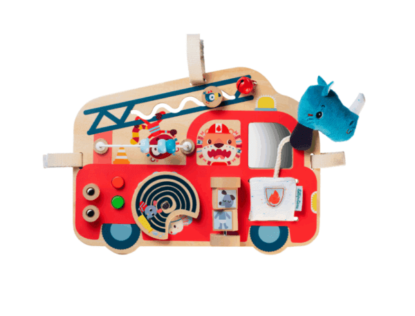 Da vas upoznamo s fora stvarima koje ovaj kamion ima: džepić iz kojeg viri simpatični nosorog (koji je ujedno i zvečka), prozorčić koji je zapravo ogledalo, abakus, zvonce, gumbiće i razne interaktivne ‘mozgalice’ za djecu.