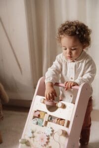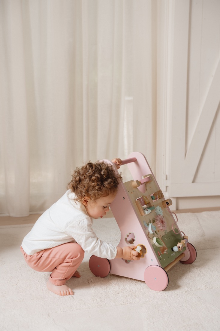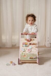 Prekrasna drvena guralica za prve korake, idealan je pratilac u razvoju vaših mališana. Drvena guralica s mnogo različitih funkcija koje privlače djetetovu pažnju. Sadrži 8 različitih aktivnosti za igru. Ova izdržljiva igračka dobar je oslonac mališanima jer je izrađena od gumiranog drveta, a ukrašena je bojama na bazi vode.