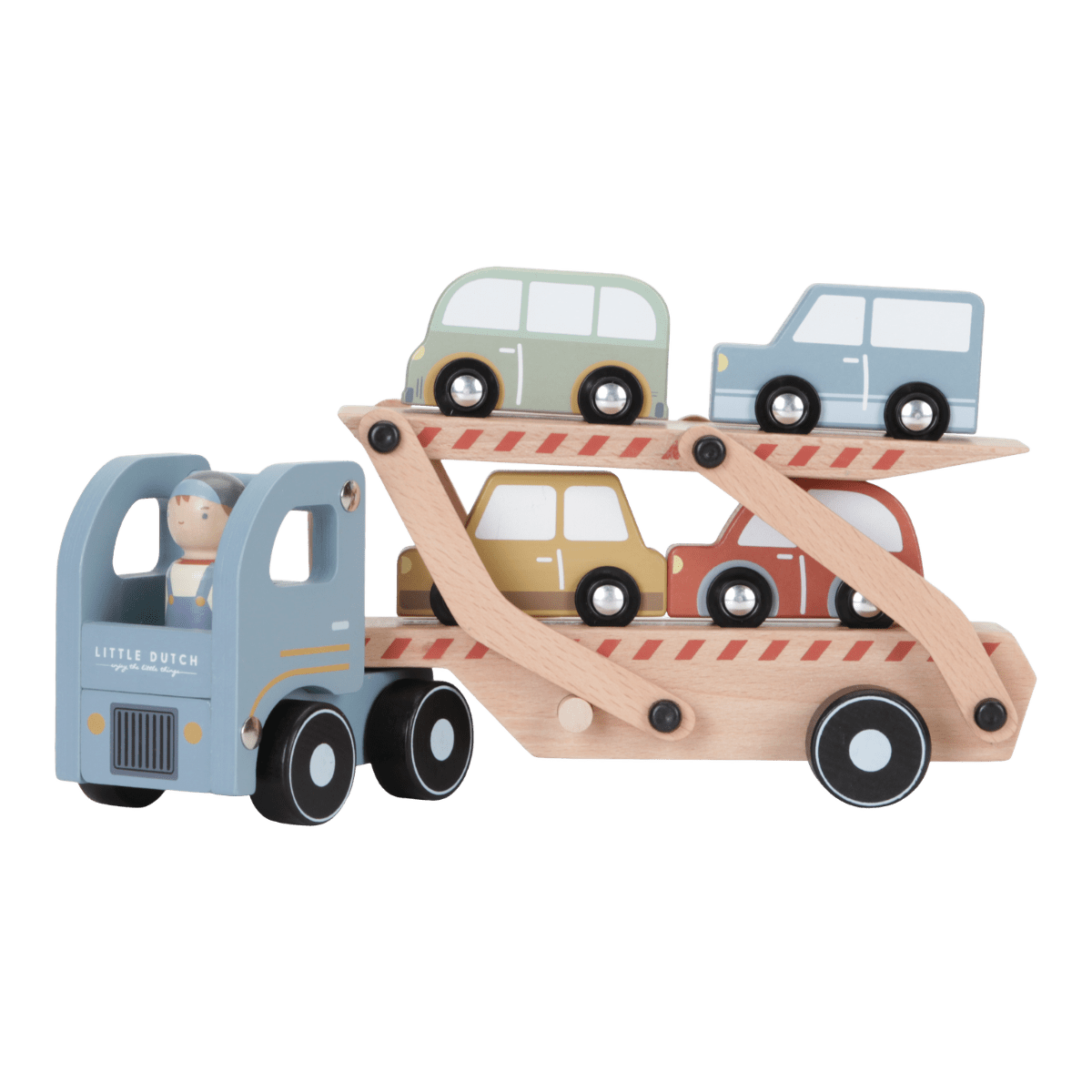 Plavi drveni autotransporter s prikolicom koja uključuje 4 automobila. Otvorite prikolicu i automobili se mogu odvesti. Ovaj će kamion zasigurno zabaviti vaše najmlađe i sjajan je dodatak vašoj kućnoj kolekciji automobila.