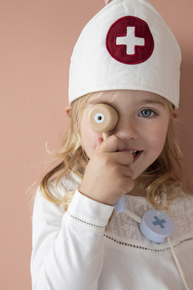 Little Dutch doktorski set sadrži sve što vaši maleni doktori mogu trebati. Set sadrži: platnenu liječničku torbu, 4 flastera različitih boja, termometar, špricu, mast, stetoskop, refleksni čekić, mjerač krvnog tlaka, otoskop, medicinsku kapu.