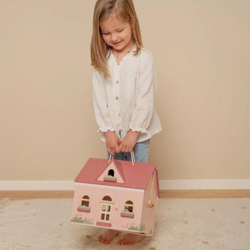 Kuća u prizemlju ima dnevni boravak i kuhinju, a na katu spavaću sobu i kupaonicu. S drvenim zatvaračem, kućica za lutke se lako otvara i zatvara, a zahvaljujući ručki, možete je lako ponijeti bilo gdje. Ova kućica za lutke uključuje opsežnu kolekciju namještaja i dodataka za mališane koji mogu ukrasiti svoju kuću kako god im srce poželi.