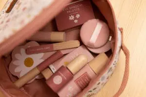 U koferu se nalazi 10 različitih drvenih kozmetičkih proizvoda. Ovdje su ručno ogledalo, bočica parfema i tuba kreme. Set također uključuje ruž za usne, lak za nokte, puder, sjenilo, maskaru i turpiju za nokte. Ova Little Dutch torba za uljepšavanje čini svu zabavu!