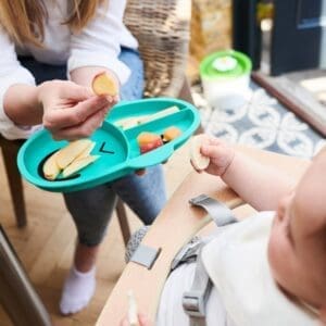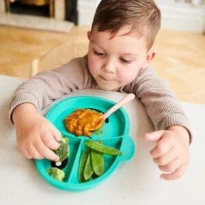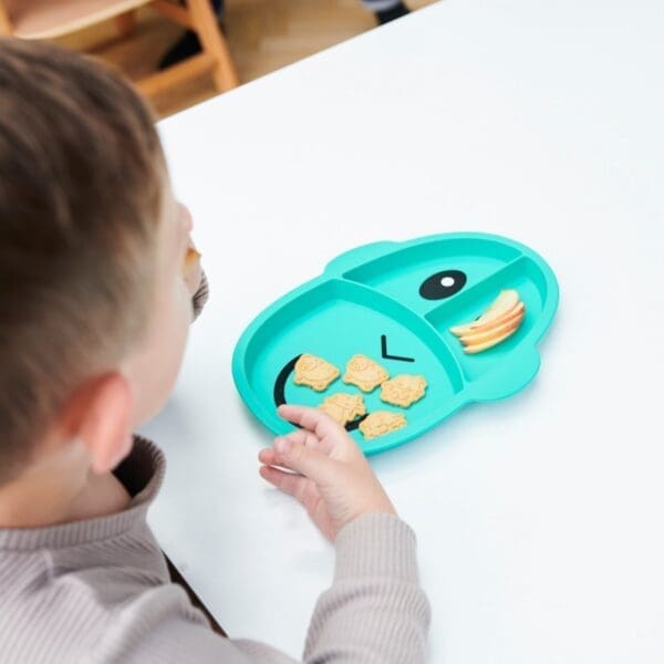 Dječji neklizajući silikonski tanjur Matchstick Monkey savršen je dodatak za posluživanje uravnoteženog obroka i odvajanje različitih tekstura i grupa namirnica. Maleni se može hraniti iz više dijelova tanjura, što potiče i razvija finu motoriku i koordinaciju oko-ruka. Razdjelna ploča izrađena je od silikona bez BPA i ftalata, a protuklizni materijal za držanje sprječava veće prolijevanje hrane. Može se prati u perilici posuđa i mikrovalnoj pećnici. Dječji podijeljeni silikonski tanjur dolazi u tri zabavne boje!