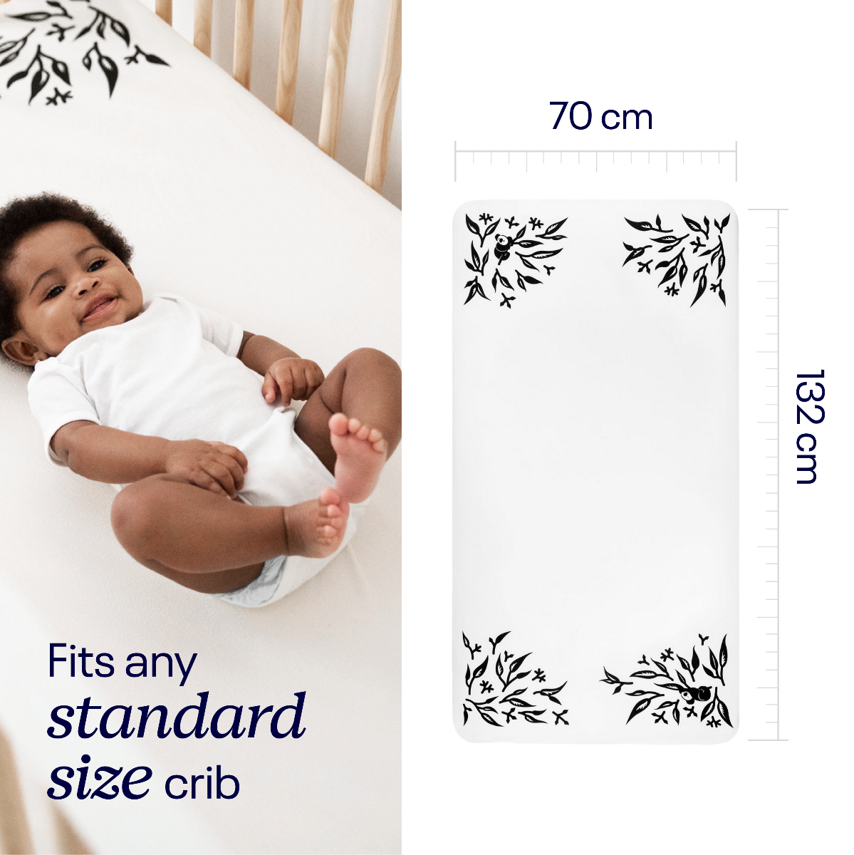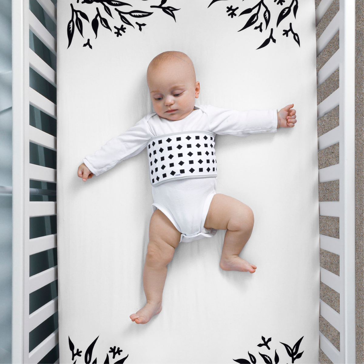 Stavite svoju bebu na plahtu i kamera će automatski očitati prilagođeni uzorak kako biprocijenila bebine mjere — što vam omogućuje jednostavno i precizno praćenje bebinog rasta sgotovo bilo kojeg uređaja s aplikacijom Nanit.