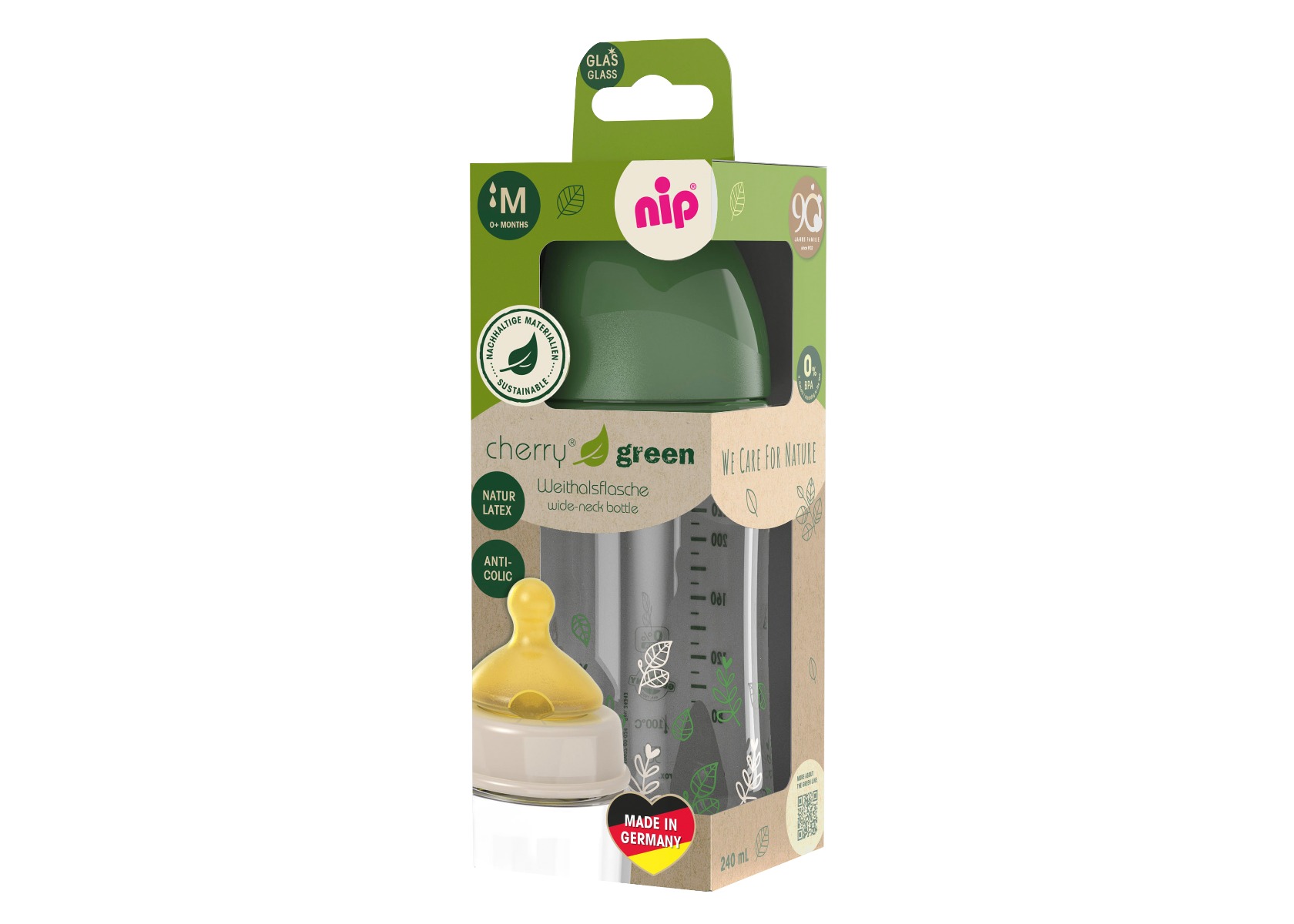 nip® Cherry® Green staklena bočica 240 ml – M protok idealan je izbor za bebe koje prelaze na srednji protok hranjenja i za roditelje koji žele kombinaciju sigurnosti, praktičnosti i elegantnog dizajna.
