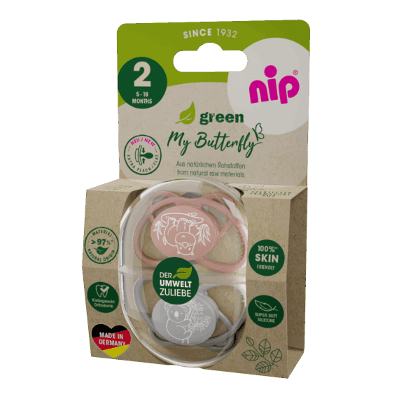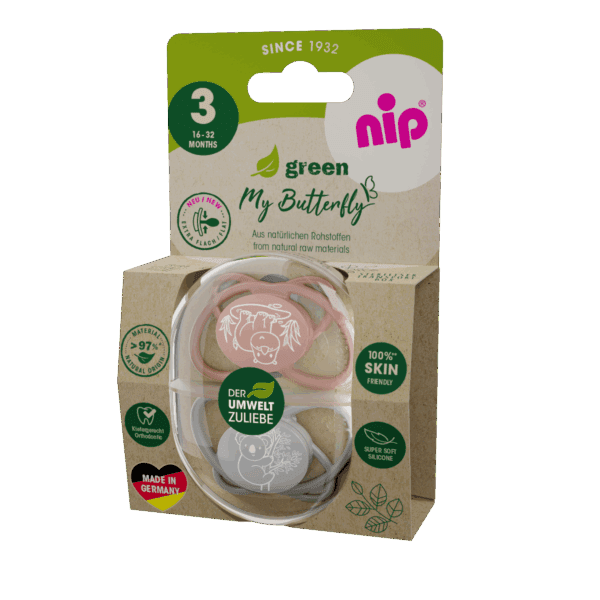 Sada još održivija i bolja za rast zuba – duda varalica nip® My Butterfly Green izrađena je od više od 97% prirodnih sirovina*. Uklonili smo najviše nepotrebnog materijala ambalaže koliko smo mogli. Zbog simetričnog oblika sisača, duda varalica ne može se koristiti naopako. Izuzetno plosnat i mekan sisač ortodontski je oblikovan i pogodan uz dojenje. Zbog tankog i laganog oblika štitnika s velikim ventilacijskim otvorima mnogo zraka dolazi do osjetljive bebine kože, što može spriječiti osip i iritaciju te sam štitnik čini posebno ugodnim za nošenje. Kao i sve nip® dude varalice sa silikonskim sisačem, nip® first moments My Butterfly izrađen je od super mekanog silikona i imitira prirodno sisanje. Kutija za sterilizaciju s 2 odjeljka omogućuje odvojeno pohranjivanje dviju duda varalica u isto vrijeme. Pogodna je za jednostavnu dezinfekciju u mikrovalnoj pećnici. Duda varalica je spremna za ponovnu upotrebu u roku od nekoliko minuta. My Butterfly Green duda varalica živih je boja i sadrži slatke životinjske motive za proljetno buđenje. Duda varalica je dostupna u tri različite veličine.