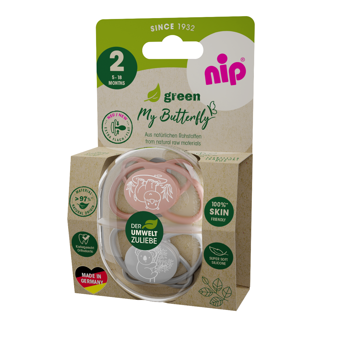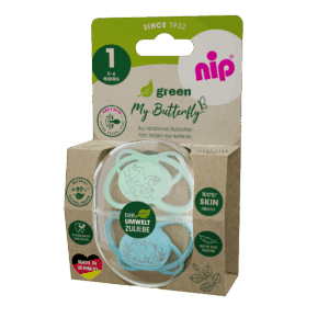 Sada još održivija i bolja za rast zuba – duda varalica nip® My Butterfly Green izrađena je od više od 97% prirodnih sirovina*. Uklonili smo najviše nepotrebnog materijala ambalaže koliko smo mogli. Zbog simetričnog oblika sisača, duda varalica ne može se koristiti naopako. Izuzetno plosnat i mekan sisač ortodontski je oblikovan i pogodan uz dojenje. Zbog tankog i laganog oblika štitnika s velikim ventilacijskim otvorima mnogo zraka dolazi do osjetljive bebine kože, što može spriječiti osip i iritaciju te sam štitnik čini posebno ugodnim za nošenje. Kao i sve nip® dude varalice sa silikonskim sisačem, nip® first moments My Butterfly izrađen je od super mekanog silikona i imitira prirodno sisanje. Kutija za sterilizaciju s 2 odjeljka omogućuje odvojeno pohranjivanje dviju duda varalica u isto vrijeme. Pogodna je za jednostavnu dezinfekciju u mikrovalnoj pećnici. Duda varalica je spremna za ponovnu upotrebu u roku od nekoliko minuta. My Butterfly Green duda varalica živih je boja i sadrži slatke životinjske motive za proljetno buđenje. Duda varalica je dostupna u tri različite veličine.
