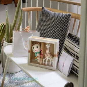 Poklon pakiranje “Žirafa Sophie i stiskavac” savršen je dar za novorođenče, pružajući mu senzorno iskustvo koje potiče razvoj svih osjetila.