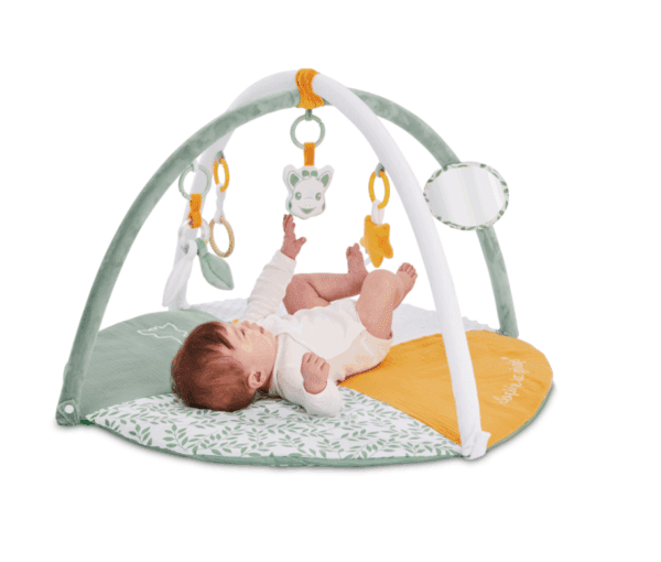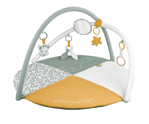 Ovaj predivan baby gym ima čak 2 strane. S jedne strane nalazi se luk (koji se može skinuti) na kojem će vaši najmanji pronaći različite stvari za poticanje motorike i osjetila: ogledalo, zvono, prsten za zubiće, zgužvani papir, a kada njihove umorne okice savlada san, uvijek mogu malo i odrijemati.
