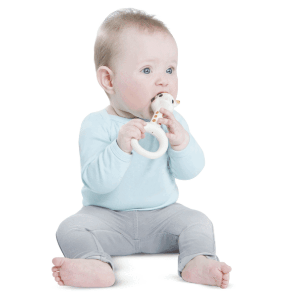 Ima puno različitih površina koje beba može žvakati: uši, rogove, noge i dvostupanjski obruč. Prilagođen je malim bebinim rukama.
