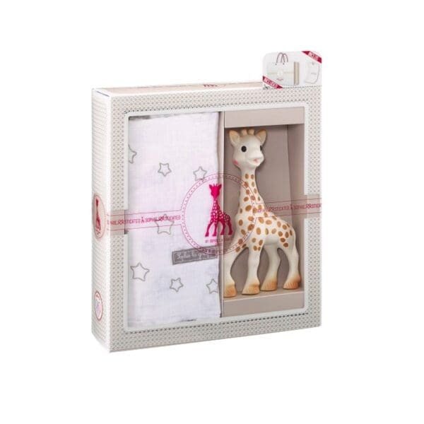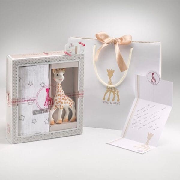 Zahvaljujući ovom poklon setu, dobivate Sophie žirafu te tetra pelenu za zamatanje bebe. Da bi se poklonio savršen dar, ovaj set popraćen je prilagodljivom poklon karticom i prekrasnom torbom za darove.