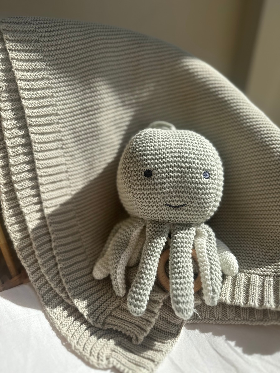 Nježana i mekana igračkica s tihom glazbom. Ova hobotnica brzo će postati jedna od omiljenih stvari vašeg djeteta.Povucite drveni prsten i glazbeni mobile će zasvirati najfiniju jasnu i mirnu “Sleep baby sleep” koja će umiriti svako dijete.